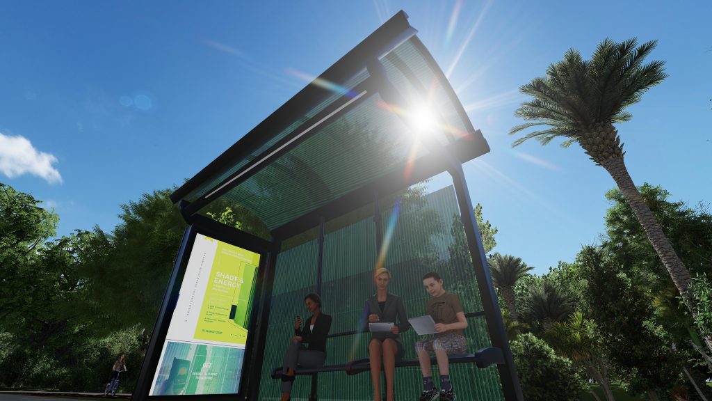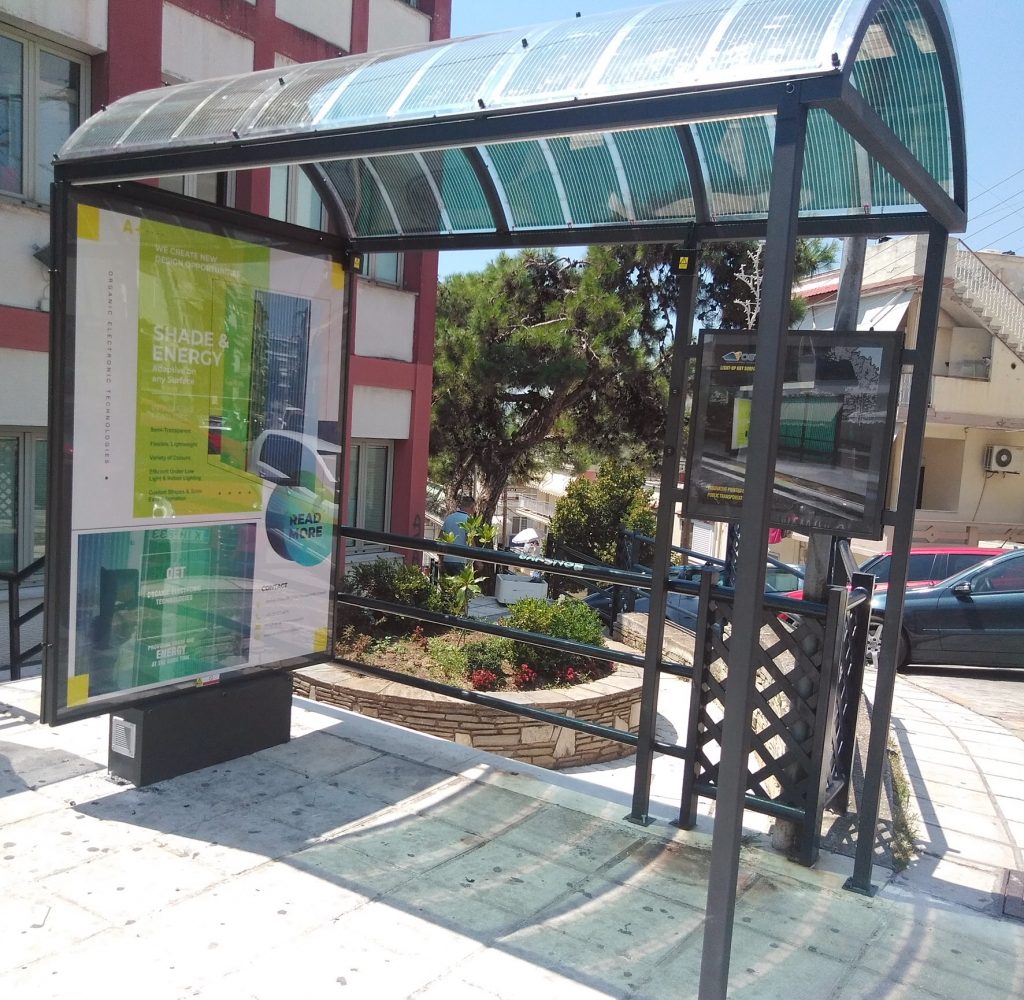 Η ενεργειακά αυτόνομη στάση, όπως είναι η επίσημη ονομασία της, είναι εξοπλισμένη με εκτυπώσιμα οργανικά φωτοβολταϊκά τα οποία καλύπτουν τον καμπυλωτό θόλο της στάσης, παράγοντας ενέργεια από το διάχυτο φως. Έτσι, δίνεται η δυνατότητα στους δημότες-επιβάτες,προφυλασσόμενοι από τις UVυπεριώδεις ακτίνες του ήλιου, να φορτίζουν το κινητό τηλέφωνό τους κατά το διάστημα αναμονής του λεωφορείου έχοντας στη διάθεσή τους τέσσερις θύρες USB.